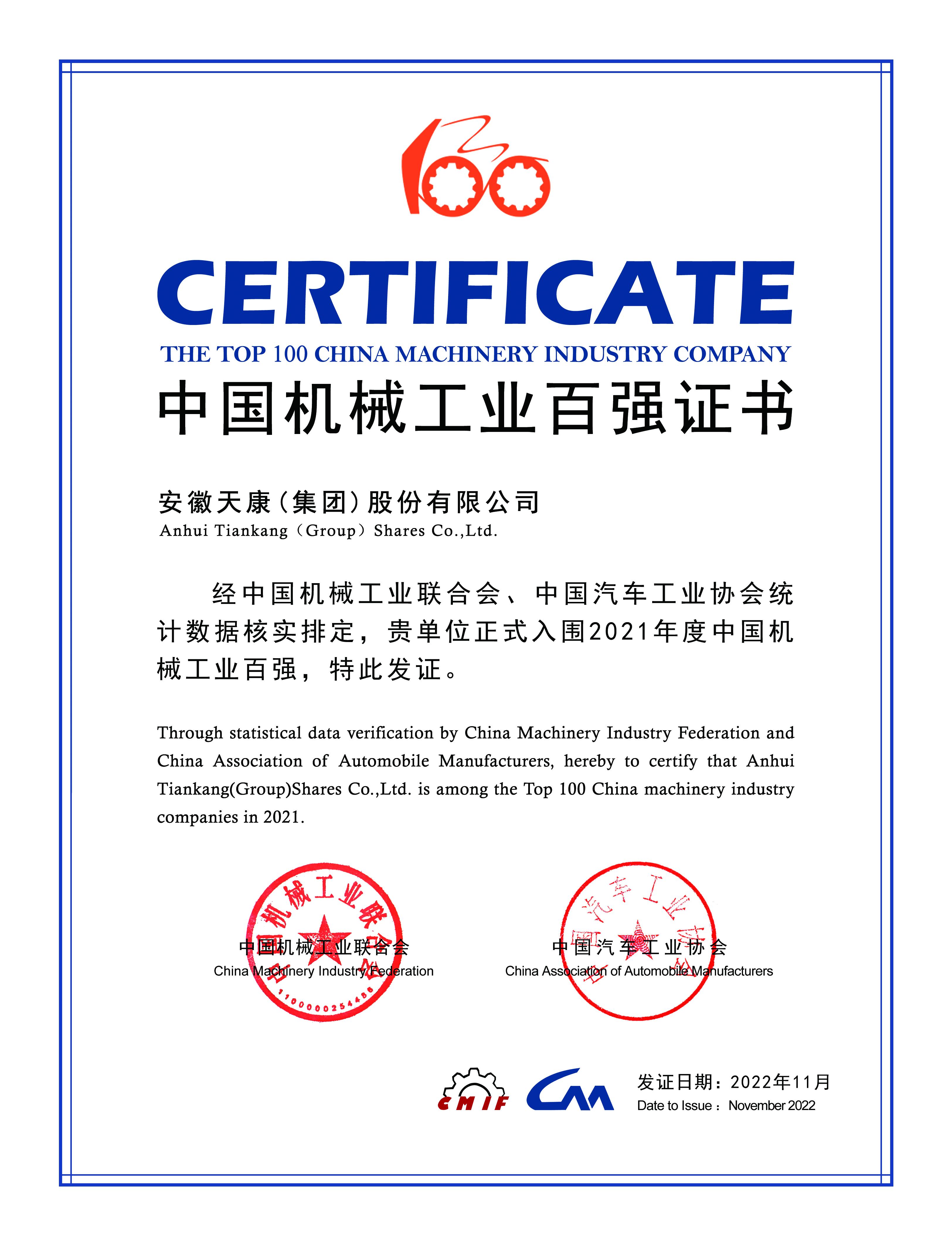 2022年中國機械工業百強證書