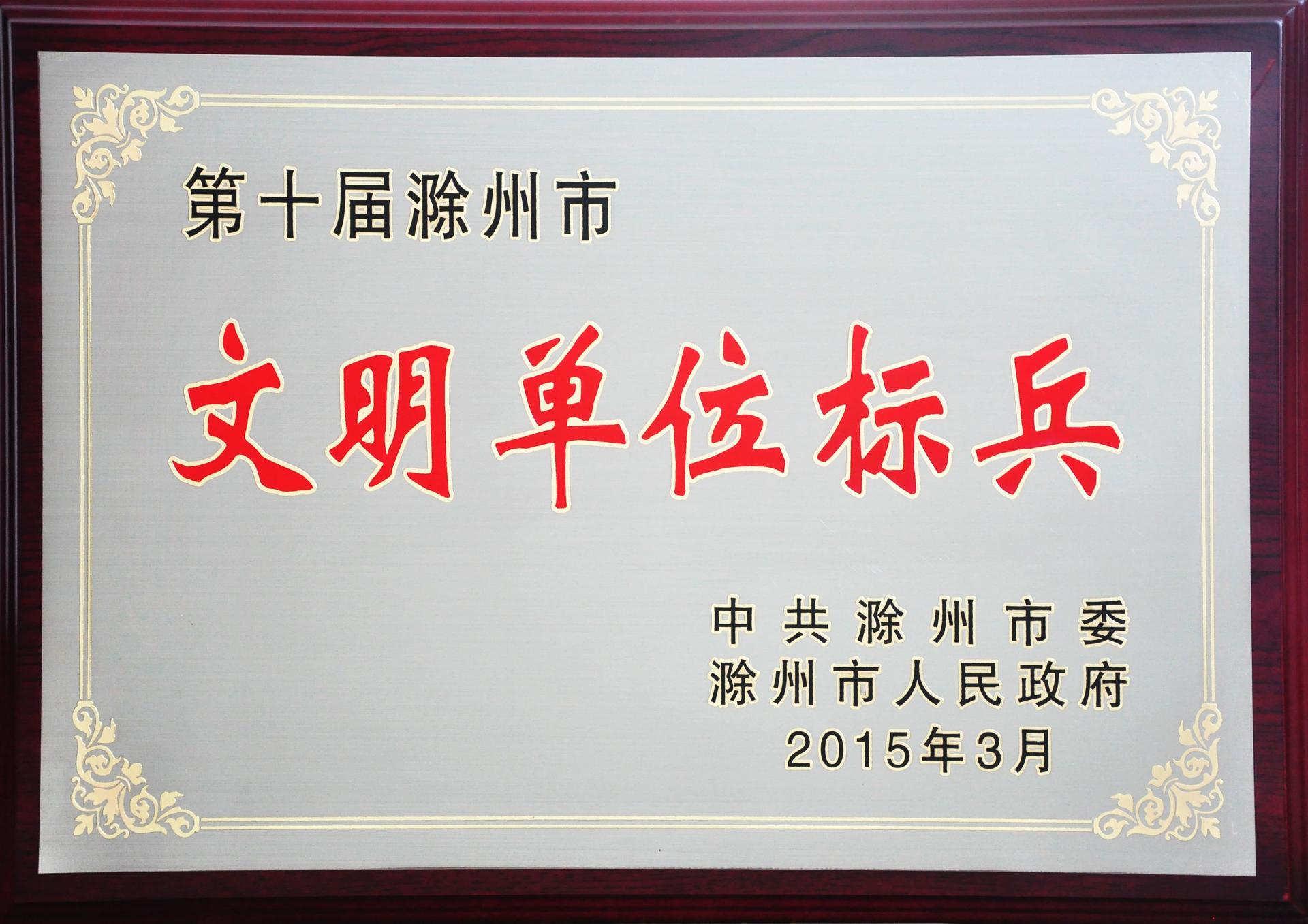 2015年3月,被滁州市委、市政府授予第十屆滁州市“文明單位標兵”榮譽換稱號