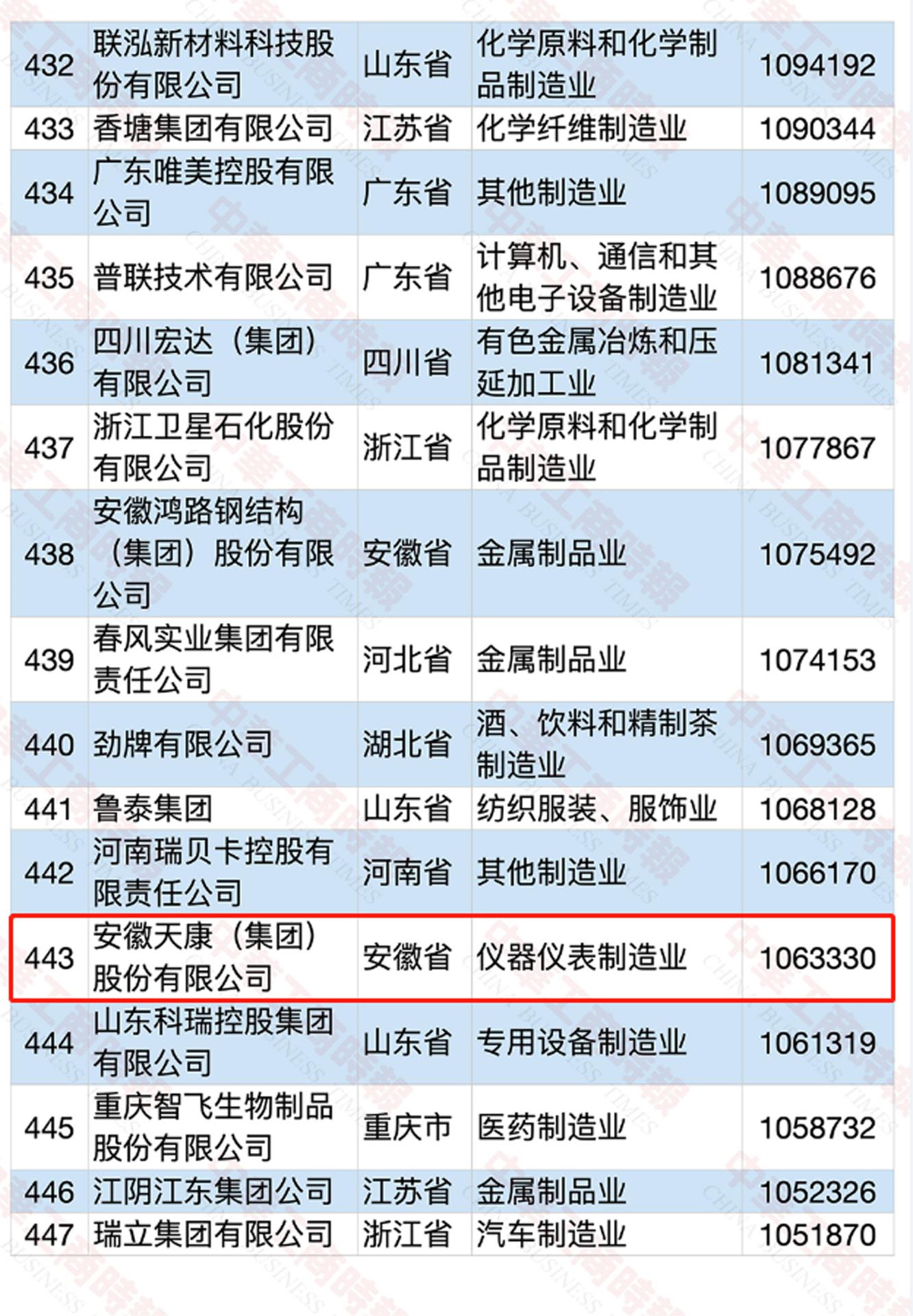 從2020中國民營企業制造業500強榜單顯示:華為投資控股有限公司、正威國際集團有限公司、恒力集團有限公司位列“2020中國制造業民營企業500強”前三名; 安徽天康(集團)股份有限公司以106.3億元營收入排名第443名。