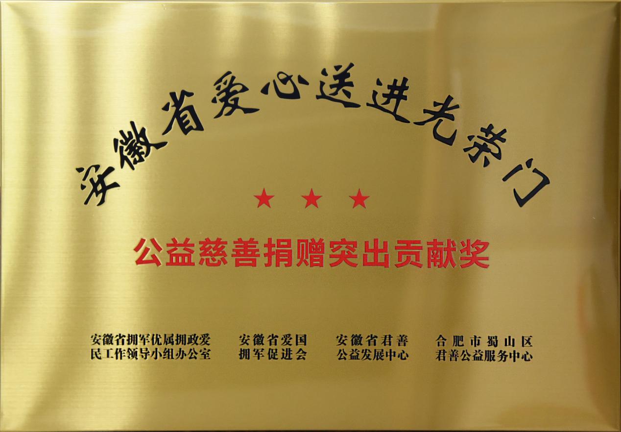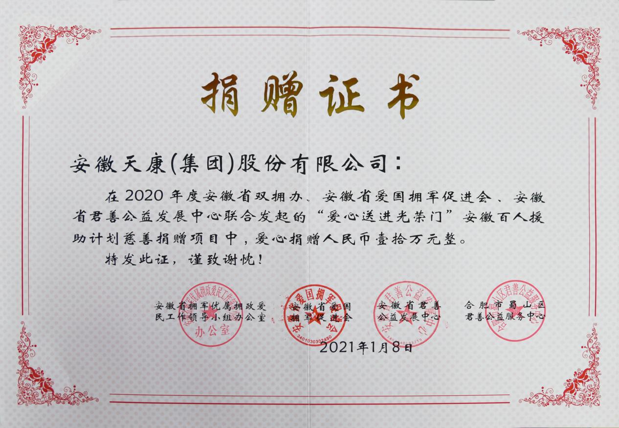 1月18日,由安徽省雙擁辦、安徽省愛國擁軍促進會、君善公益聯合發起的“愛心送進光榮門”捐助啟動儀式在合肥舉行。啟動儀式上,省退役軍人事務廳領導及君善公益負責人將愛心捐助款送到了受助對象代表手中,向“安徽最美退役軍人”表示了慰問,并分別向愛心單位、部分市退役軍人事務局頒發了榮譽牌匾和證書。安徽天康集團獲“安徽省愛心送進光榮門公益慈善捐贈突出貢獻獎”。
