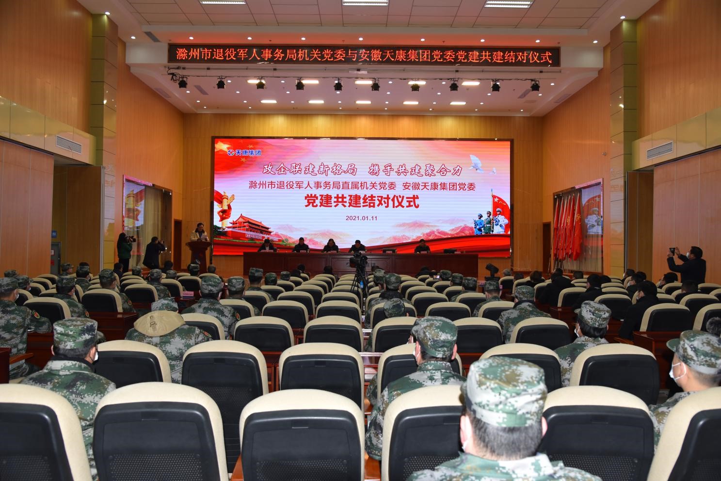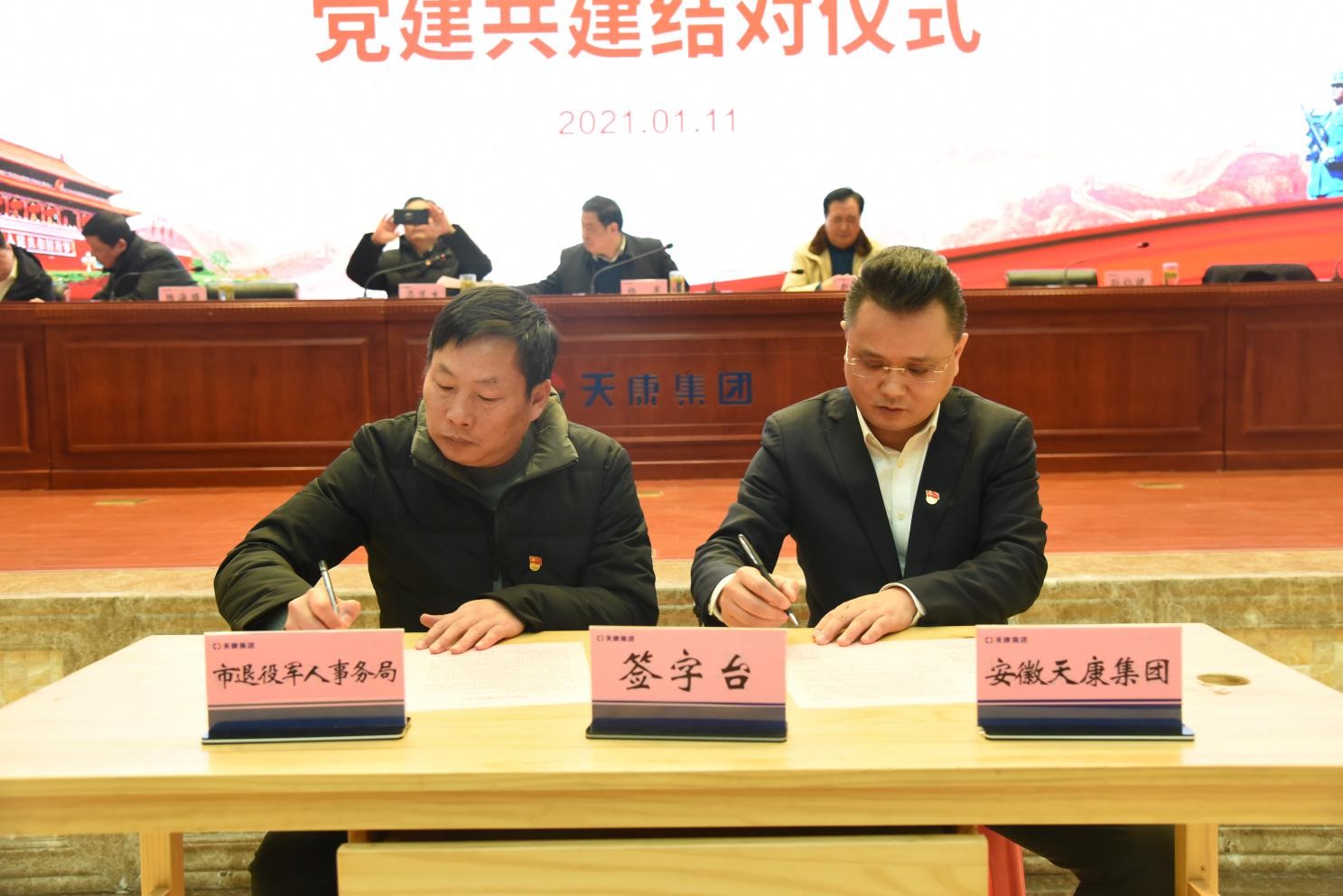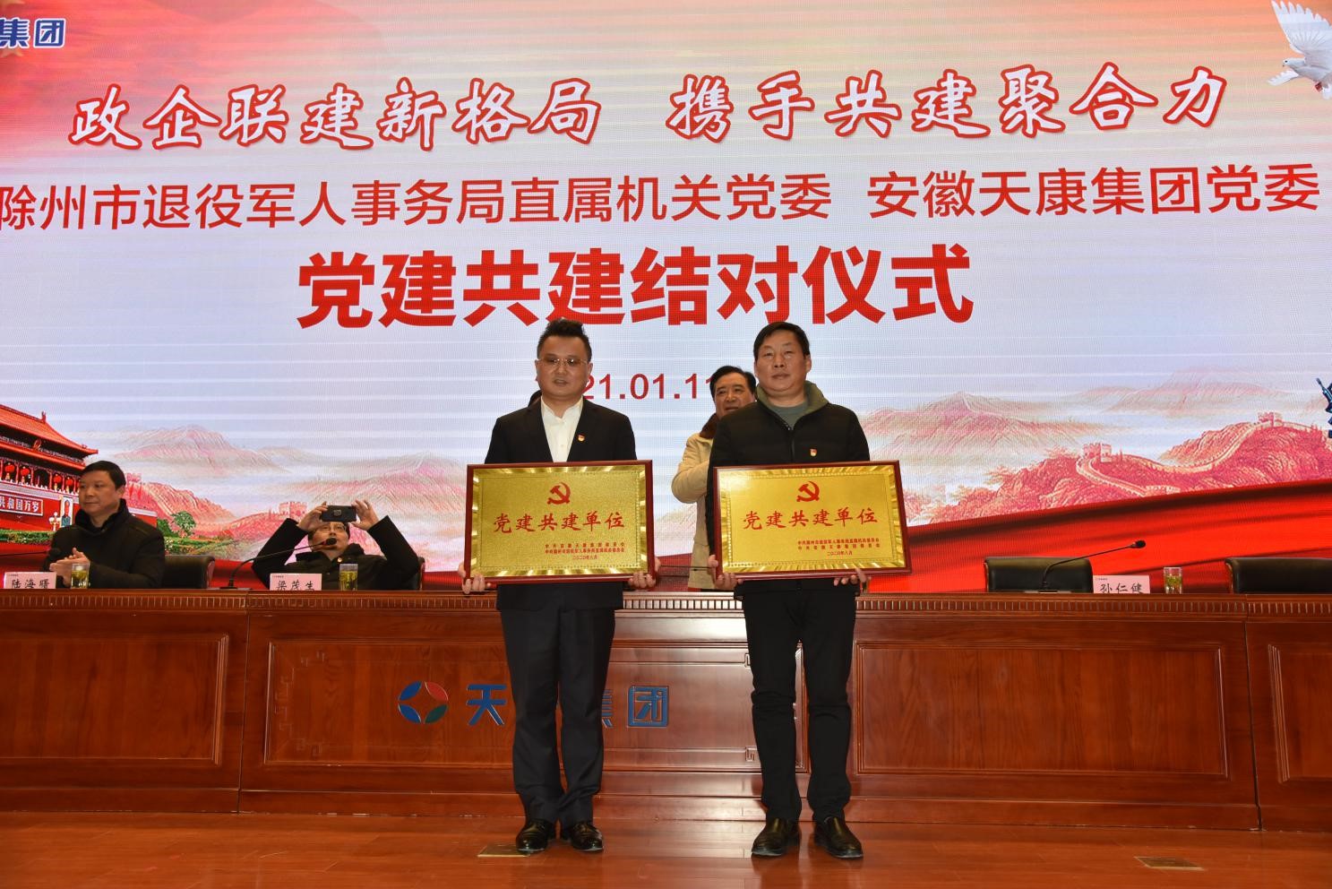 會上,滁州市退役軍人事務局黨組成員、副局長孫仁健、安徽天康集團黨委副書記、總經理毛文章代表雙方黨組織簽訂了《黨建共建協議書》、互贈“黨建共建結對單位”牌匾。雙方進行了交流發言,就各自黨組織的基本情況、優勢資源、黨建活動、典型經驗進行了介紹。儀式結束后,滁州市退役軍人事務局黨組書記、局長楊軍一行先后參觀了集團退役軍人文化長廊、退役軍人實訓基地、退役軍人服務管理站、黨建文化墻、黨委辦公室、黨員書屋,并翻閱了集團黨建活動檔案。