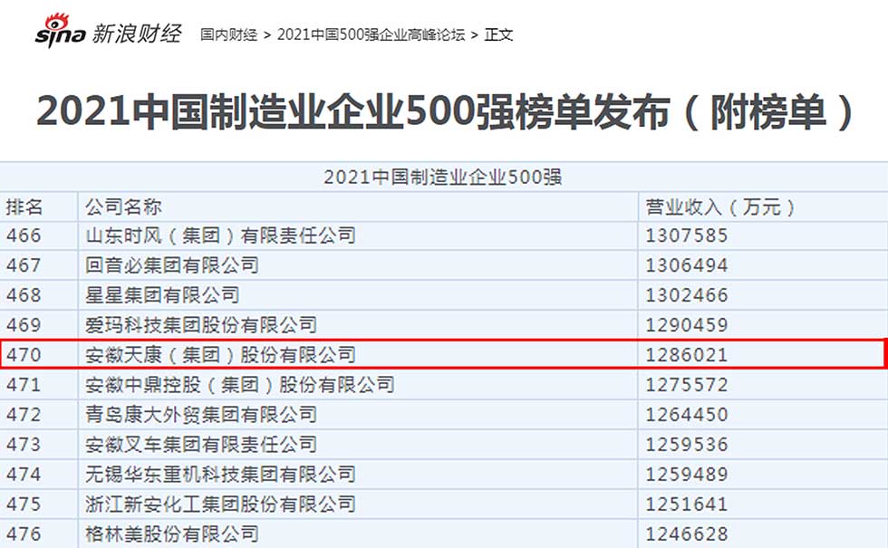 9月25日,由中國企業聯合會、中國企業家協會發布的“2021中國制造業企業500強”榜單在吉林長春揭曉。安徽天康集團榮列第470位,連續九年上榜。