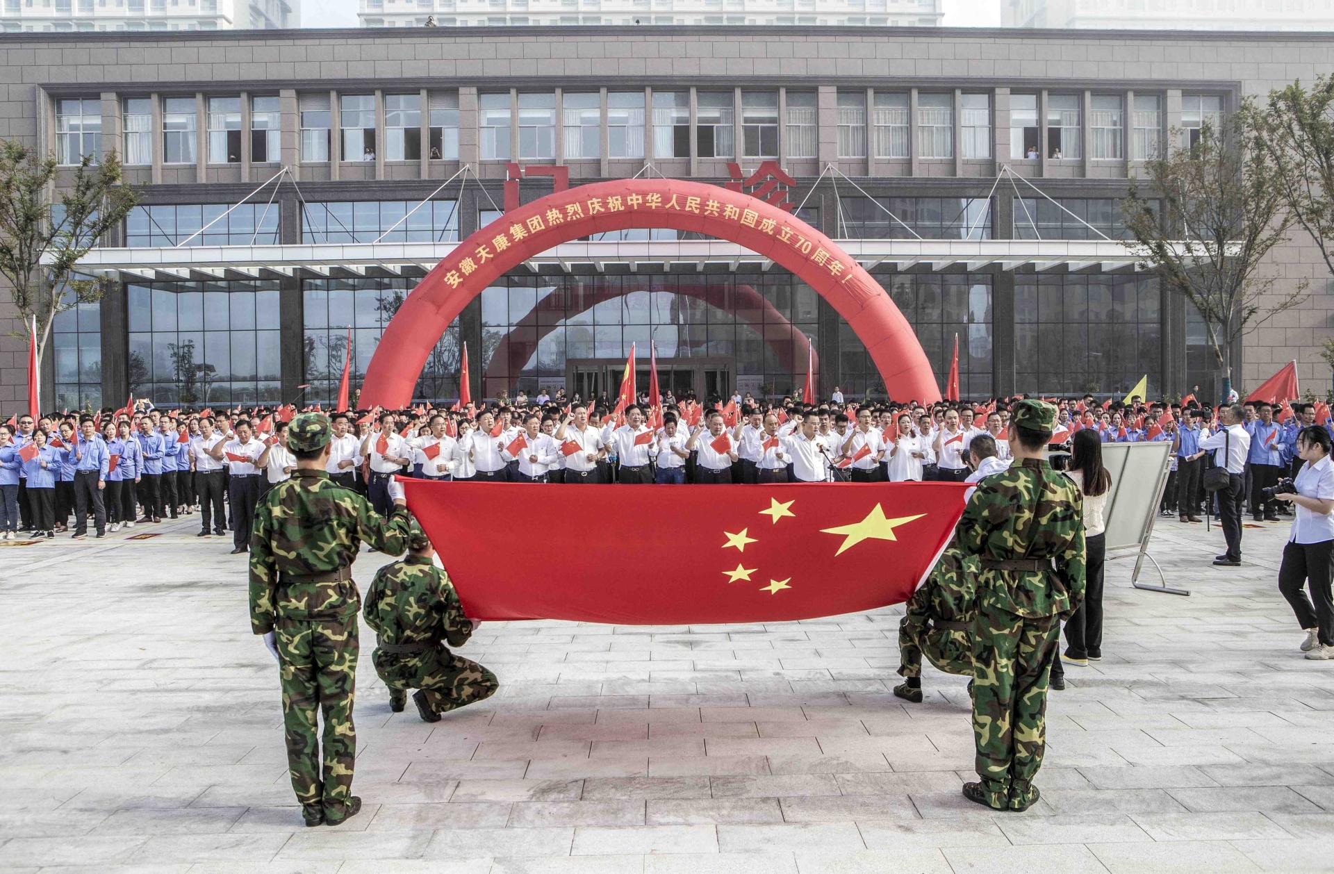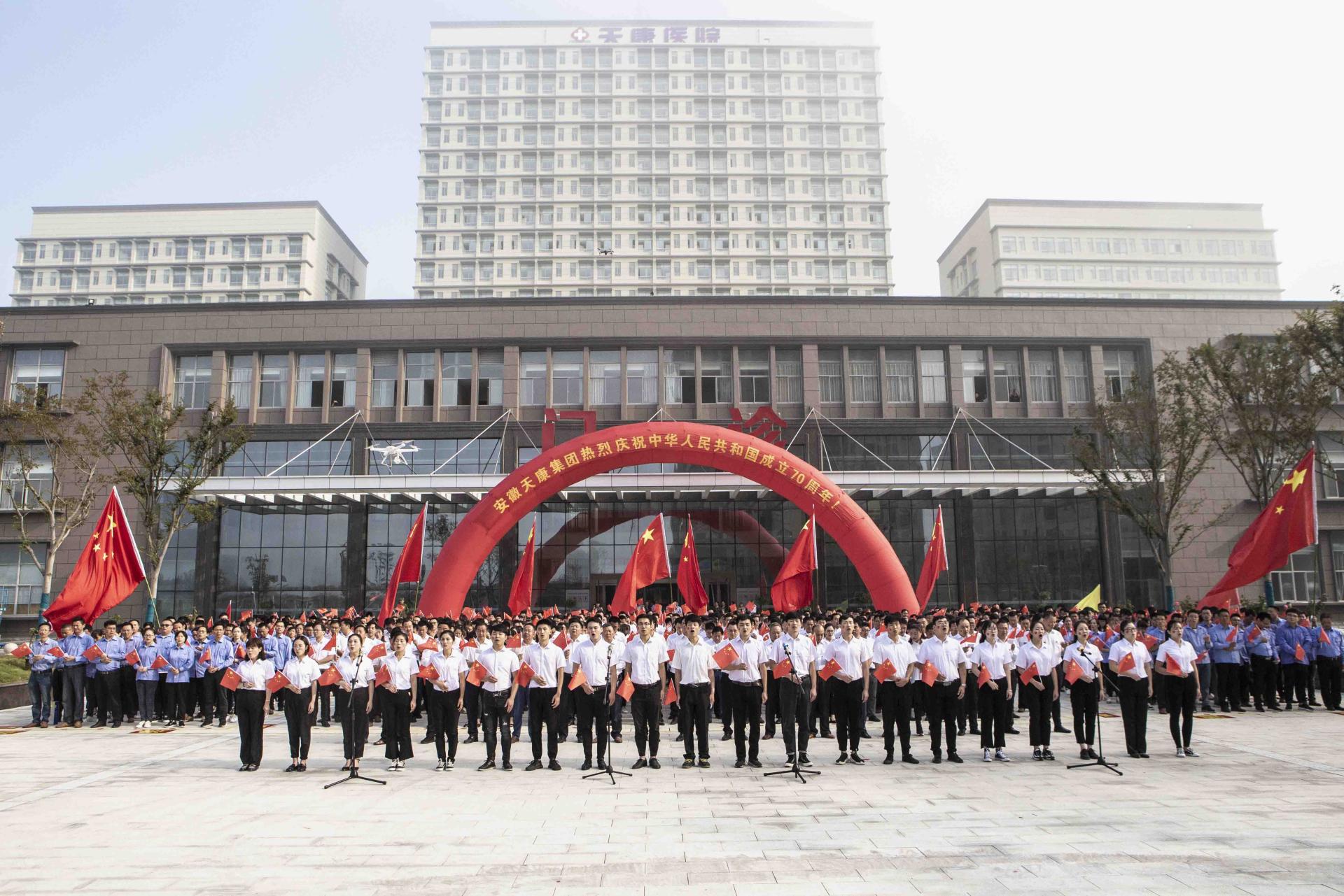 為慶祝中華人民共和國成立70周年,歌頌偉大祖國母親,9月29日上午,在集團(tuán)黨委的領(lǐng)導(dǎo)下,集團(tuán)“兩辦”、工會、共青團(tuán)、文宣部、新時代文明實(shí)踐點(diǎn)在南市區(qū)天康醫(yī)院廣場聯(lián)合舉行了以“向國旗致敬,祖國在我心中”為主題的大型升旗儀式。集團(tuán)領(lǐng)導(dǎo)、全體黨員、銷售副總、銷售經(jīng)理、副部級以上管理人員、優(yōu)秀職工代表等近千余人參加了升旗儀式。