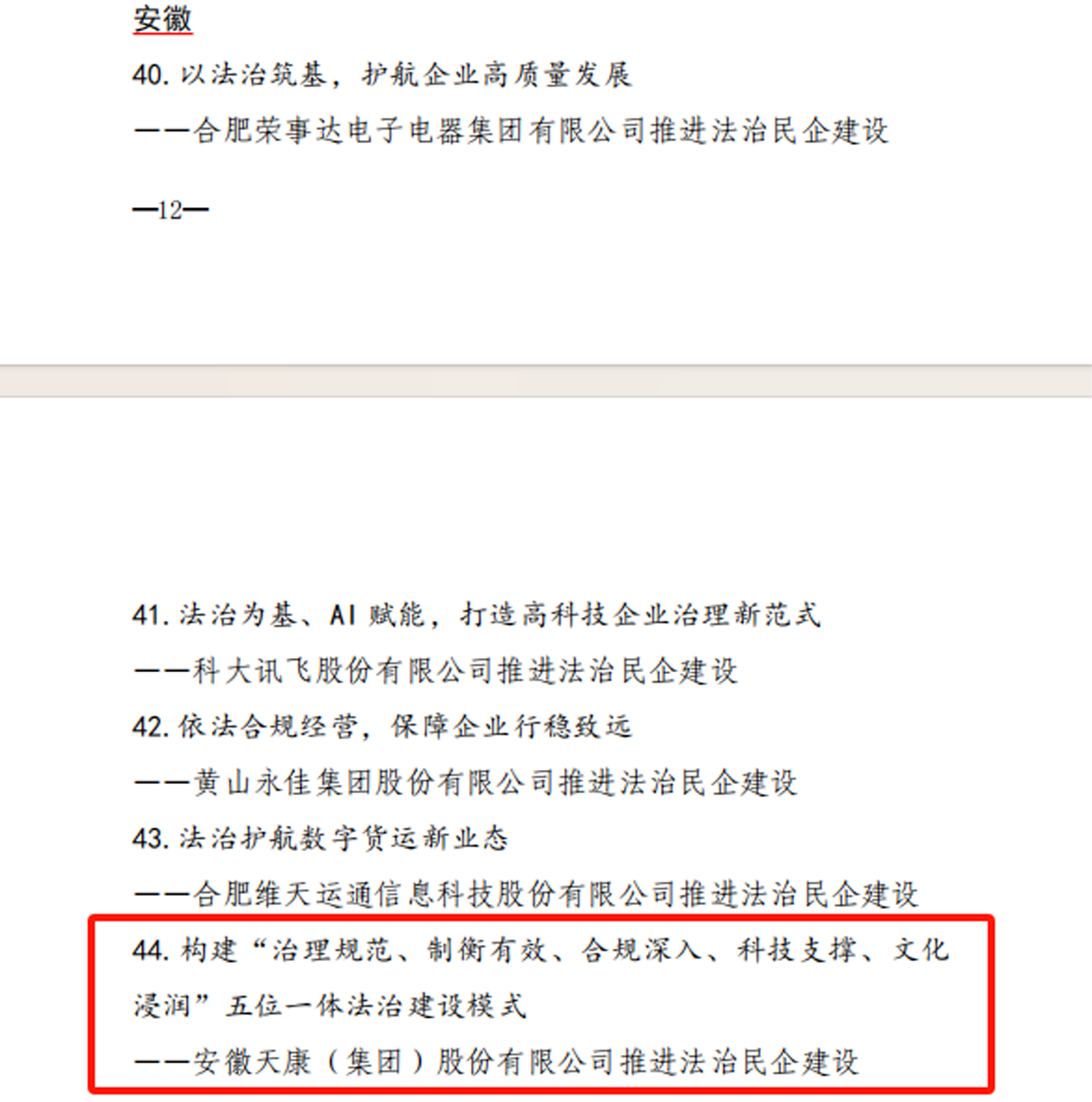 近日,全國工商聯發布《全國工商聯關于商會和民營企業推進法治民企建設典型做法的通報》,安徽天康集團憑借其創新的“五位一體”法治建設模式成功入選,成為安徽省僅有的6家獲評企業之一。這一榮譽不僅彰顯了安徽天康集團在法治民企建設中的卓越成效,也為民營企業依法合規經營樹立了標桿。