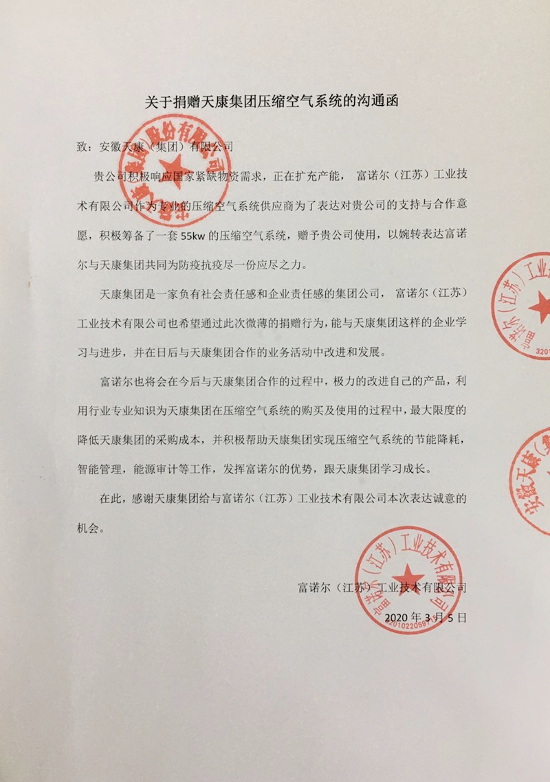 新冠肺炎疫情發生以來,舉國上下都同心協力參與這場戰“疫”,3月5日,富諾爾(江蘇)工業技術有限公司來函贈送安徽天康集團55KW的壓縮空氣系統一套,以滿足安徽天康集團擴大醫療防護物資產能的需要。 捐贈函中表示,安徽天康集團是一家負有社會責任感和企業責任感的集團公司,在新冠肺炎疫情以后,安徽天康集團積極生產一次性醫用口罩、一次性醫用防護服、醫用護目鏡等抗疫醫療物資,為國家抗疫戰疫提供了物資保障。富諾爾(江蘇)工業技術有限公司也希望通過此次捐贈能夠向安徽天康集團學習,并一道為國家疫情防控工作貢獻自己的一份力量。同時,安徽天康集團和富諾爾達成戰略合作伙伴關系,為安徽天康集團及集團終端用戶可以提供更優越的壓縮空氣解決方案。 富諾爾是德國GHH-RAND公司在中國北方合作的全系列德國GHH-RAND原裝壓縮機成套廠商,其成套的Fu promise air空壓機成為行業典范,在中國開發制造高能效變頻、永磁變頻、無油壓縮機整機。其生產的壓縮機全部高于國家能效標準,成為先進節能環保產品,并為客戶提供完整的壓縮空氣解決方案。