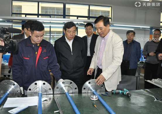 在天康集團儀表制造部,董事長趙寬向許繼偉介紹天康儀器儀表產品的相關情況。