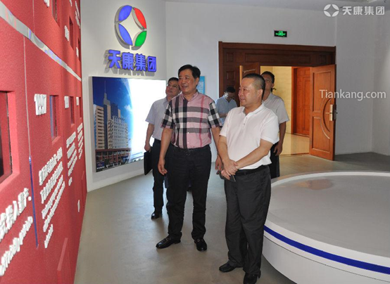 7月19日,中國農業銀行滁州分行行長李曉(右一)一行蒞臨天康考察工作,天康集團董事長趙寬在集團展示廳向李曉行長介紹天康的發展概況。