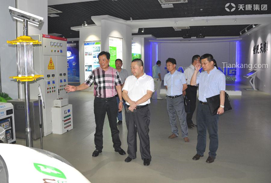 在集團展示廳,趙寬董事長向李曉行長介紹天康鋰電池、新能源殺蟲燈、植保無人機及純電動車等產品的相關情況。