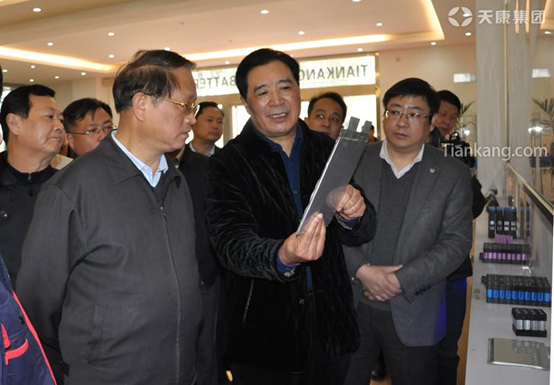 集團董事長趙寬在鋰電池生產(chǎn)線向王啟敏秘書長介紹天康鋰電池的性能優(yōu)勢與技術特點
