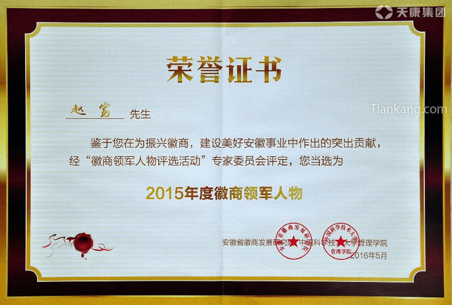 5月27日,“徽耀神州”2015(第三屆)徽商領(lǐng)軍人物評選頒獎典禮在合肥綠地福朋酒店隆重舉行,安徽省內(nèi)各大民營企業(yè)領(lǐng)軍型企業(yè)家隆重出席。安徽天康集團董事長趙寬40多年來勵精圖治,始終走在行業(yè)發(fā)展的前沿,其優(yōu)越的成就獲得了社會各界的認可,榮獲2015徽商領(lǐng)軍人物獎。