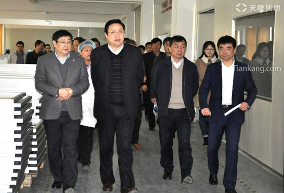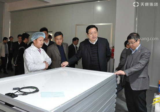 3月29日上午,滁州市副市長楊東坡(左二)率黨政代表團在天長市委副書記、市長朱大綱(左一)的陪同下調研考察天康集團光伏生產線,天康集團副總經理宋春雨(右一)向楊市長一行介紹光伏生產線的相關情況。