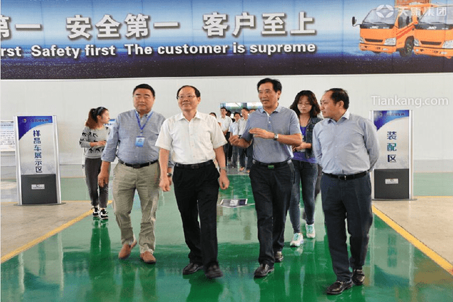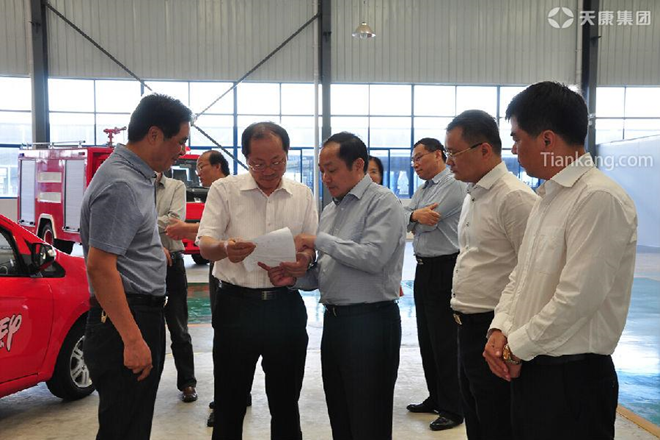 10月19日,省委第八督導組副組長項中勝(左二)考察天康特種車輛裝備生產線